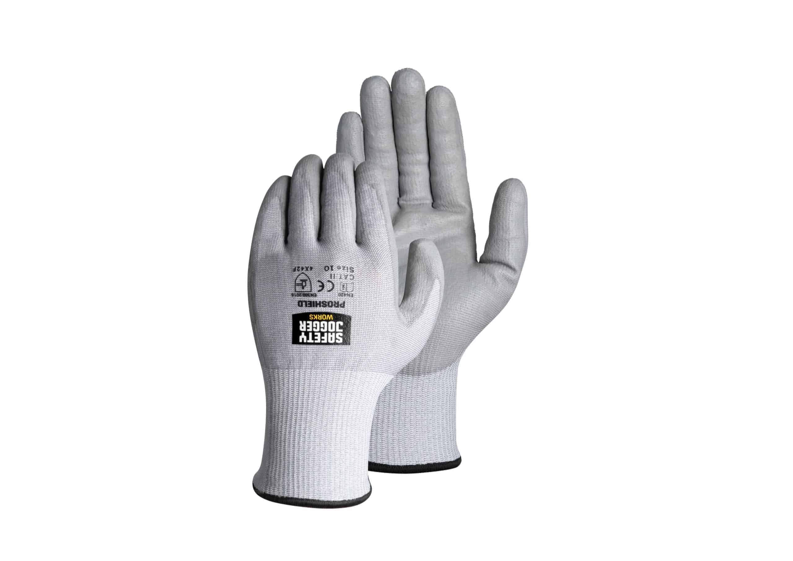 Cut resistant HPPE (high-performance polyethylene) glove with polyurethane coating. The seamless PROSHIELD cut resistant gloves of Safety Jogger guarantee a huge dexterity, safety, grip and reliability. They were designed to provide maximal strength in heavy working conditions. Next to a maximal cut resistance (level F) these gloves provide excellent comfort and dexterity. The ideal solution for work activities with risk of cuts. High anti-cut level with full wrist protection, strong dexterity level due to the 15 gauge lining.